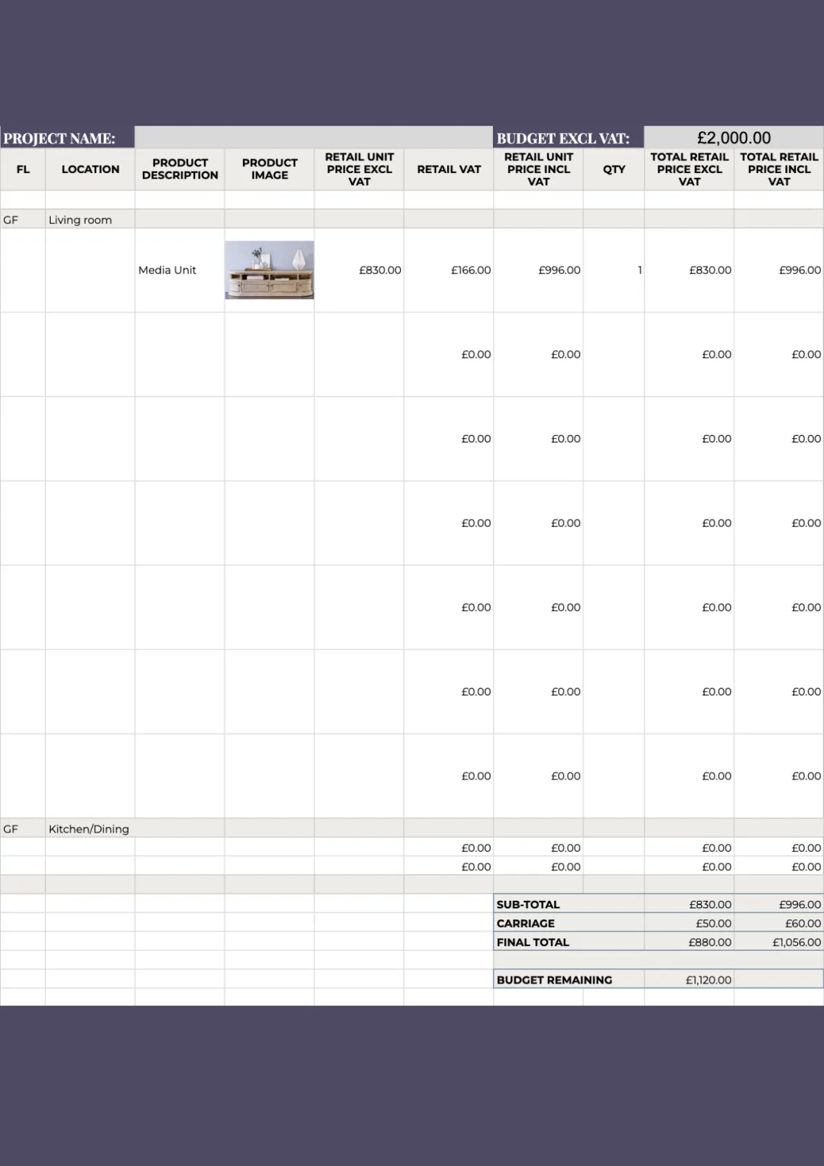 Main Budget Document: Features client and trade views with trade and retail pricing side by side.