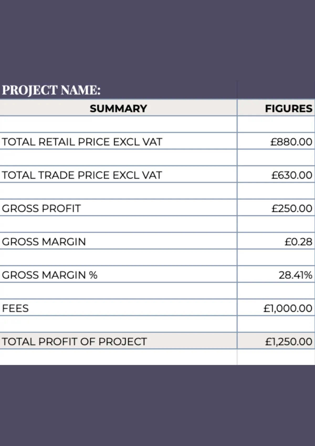 Project Summary Page: View overall profit margins and key financial figures at a glance.