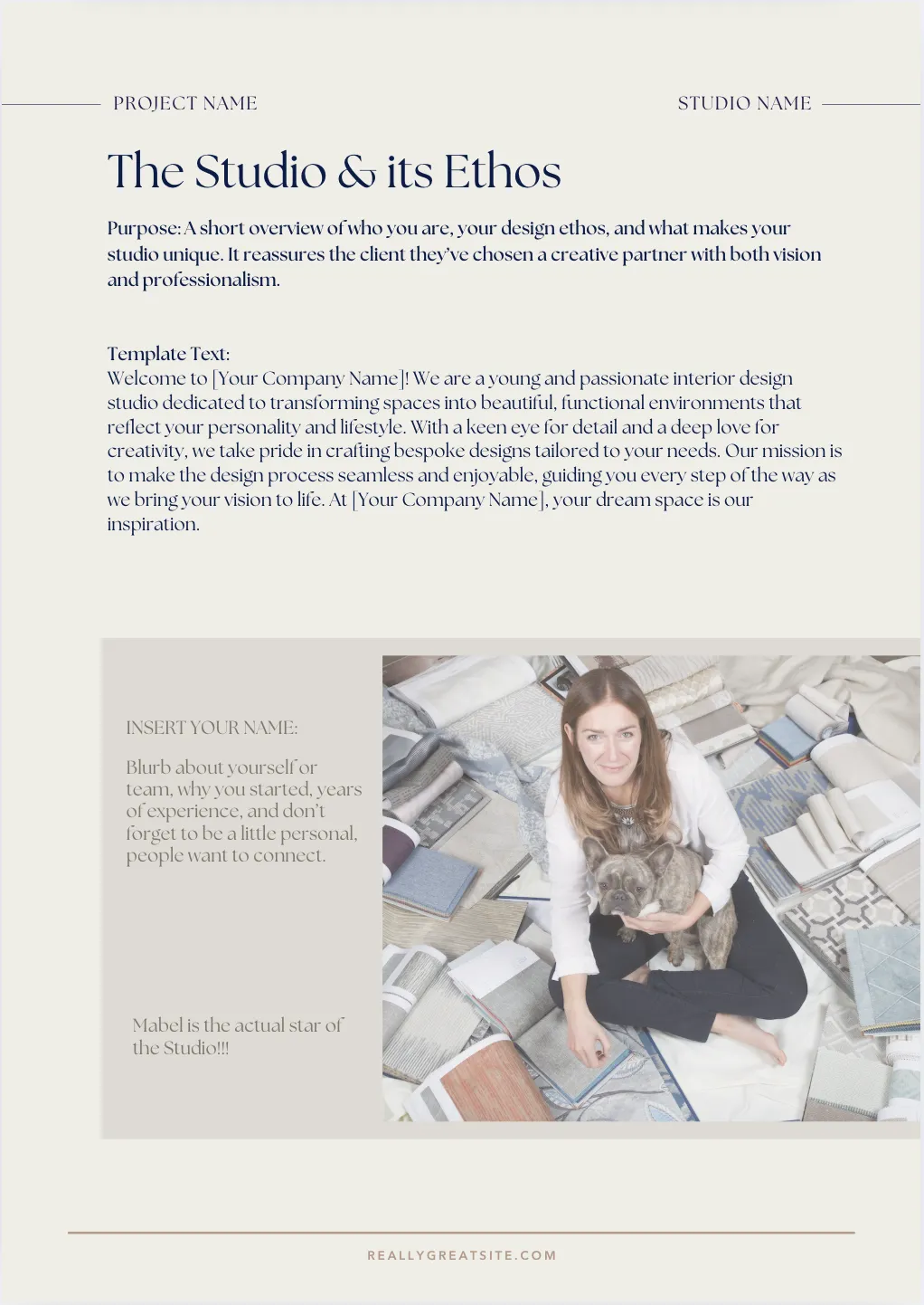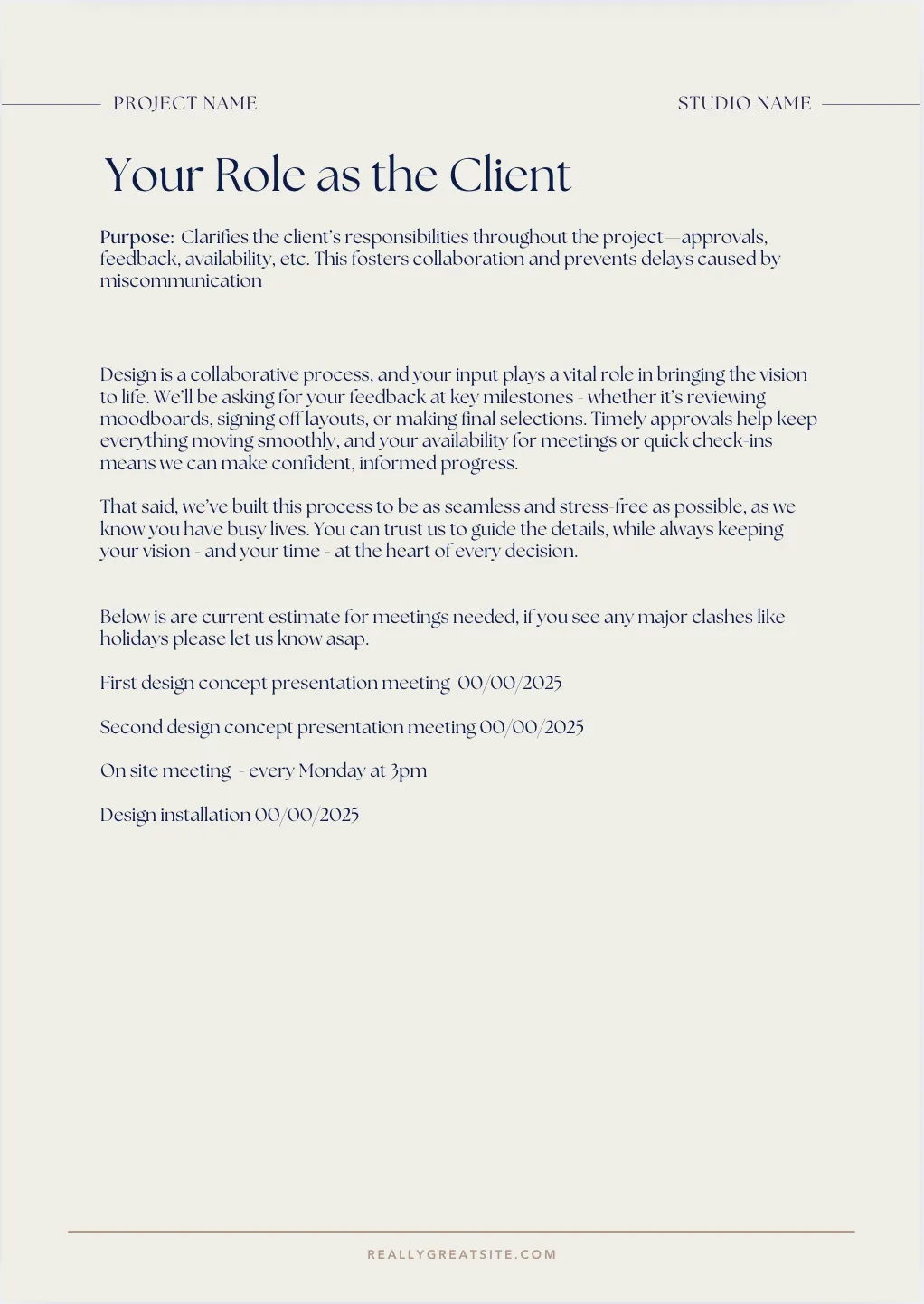 Introduction & Studio Overview: Welcome your client and introduce your practice, values, and team.