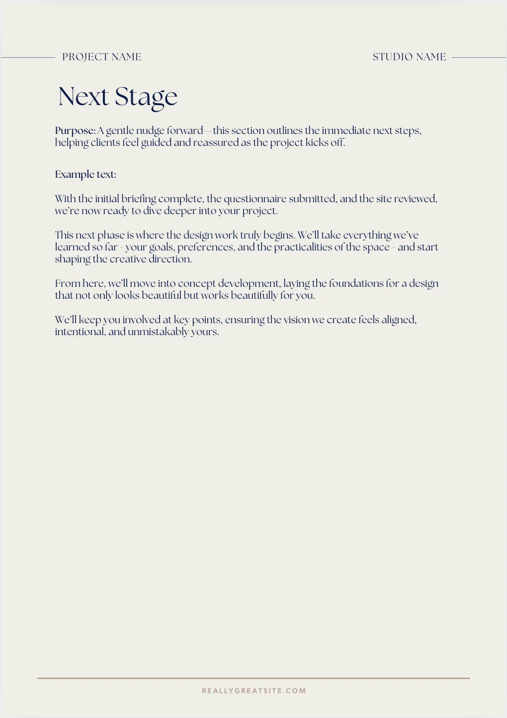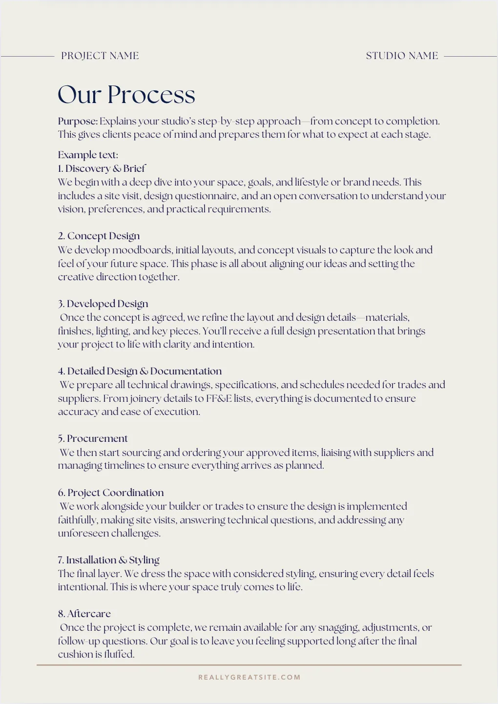 Your Process: Walk clients through your design phases to build clarity and confidence.