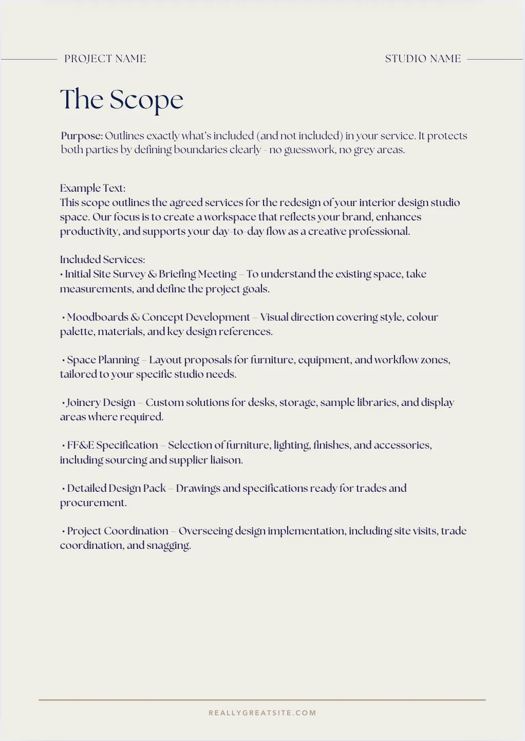 The Brief & Scope of Works: Clearly outline what’s been agreed—and what’s not—to avoid scope creep later.