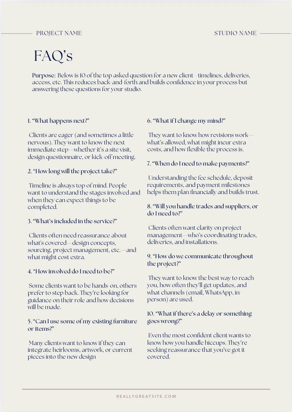 FAQs: Show professionalism and preparedness with thoughtful inclusions clients rarely expect.