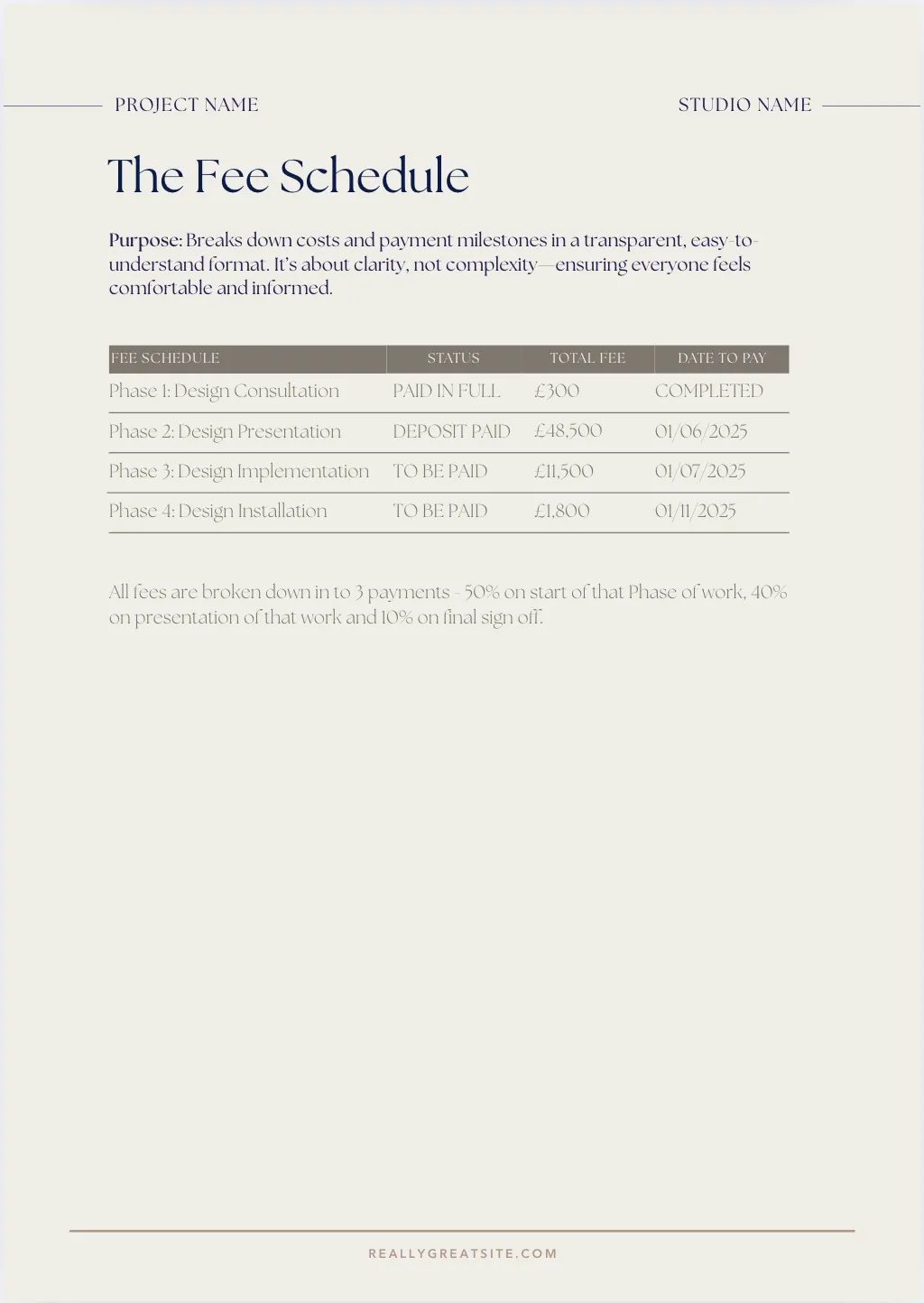 Fee Schedule: Present your fees and payment milestones in a clear, no-surprises format.