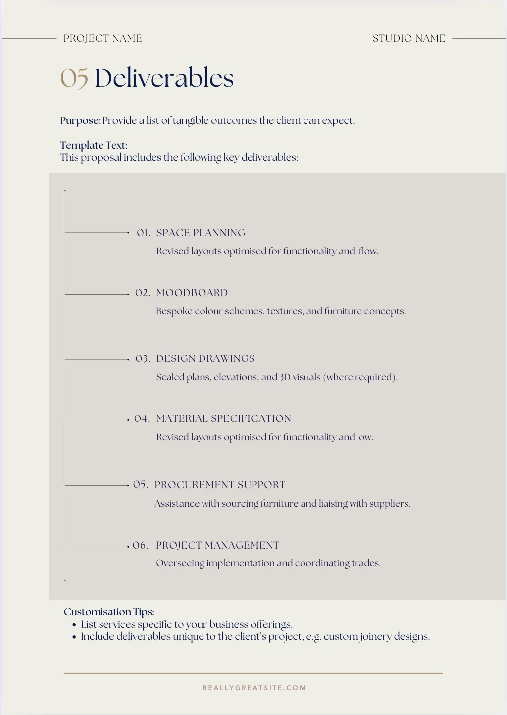 Assumptions & Deliverables: Set clear expectations for both parties.