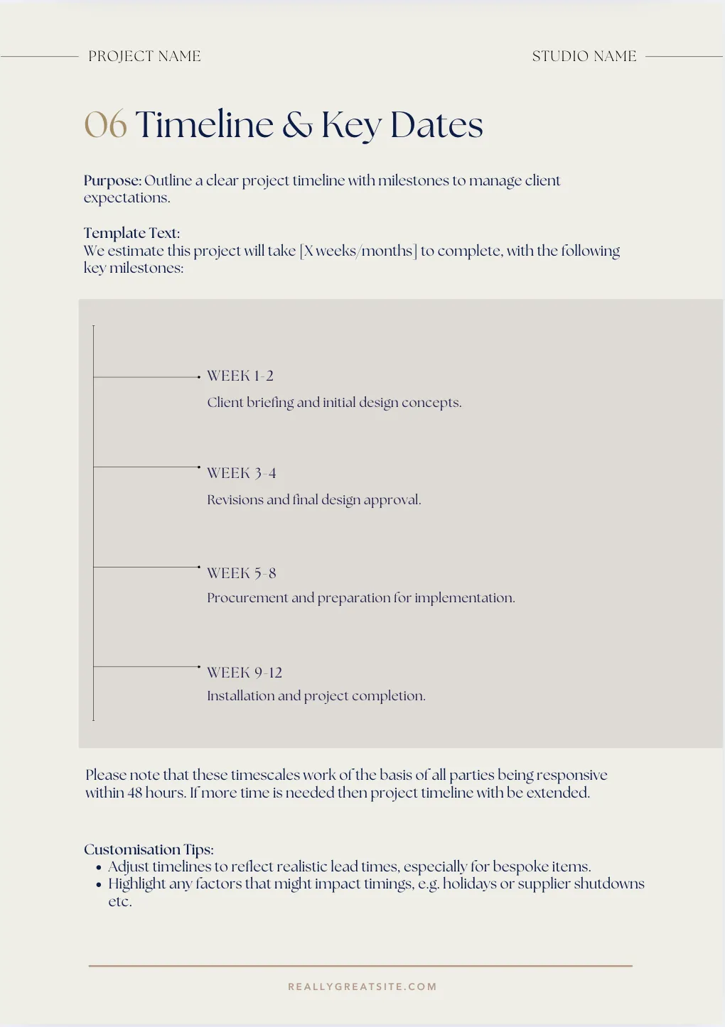 Timeline & Key Dates: Keep your project on track with a detailed schedule.